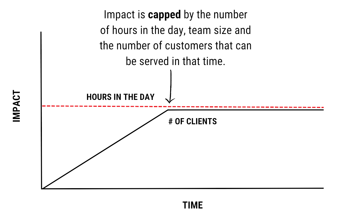 Your service-based business depends on the amount of skilled people and the number of hours in the day available for projects that make an impact. There is a natural limitation within service work. Just doing more of it will not drive large-scale impact.