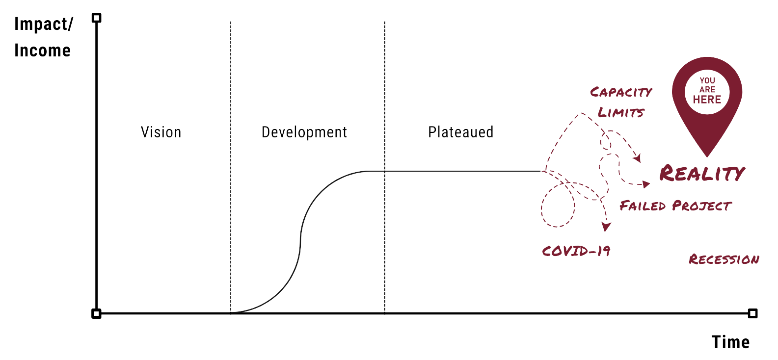 While the dream is to create big picture change, you get stuck in prevailing conditions. Limited capacity due to a lack of skilled employees, the current economic crisis or failed attempts to productise leaves the company on a plateau in terms of impact and revenue. From there, you haven’t moved for months, and you might stay stuck there for years.